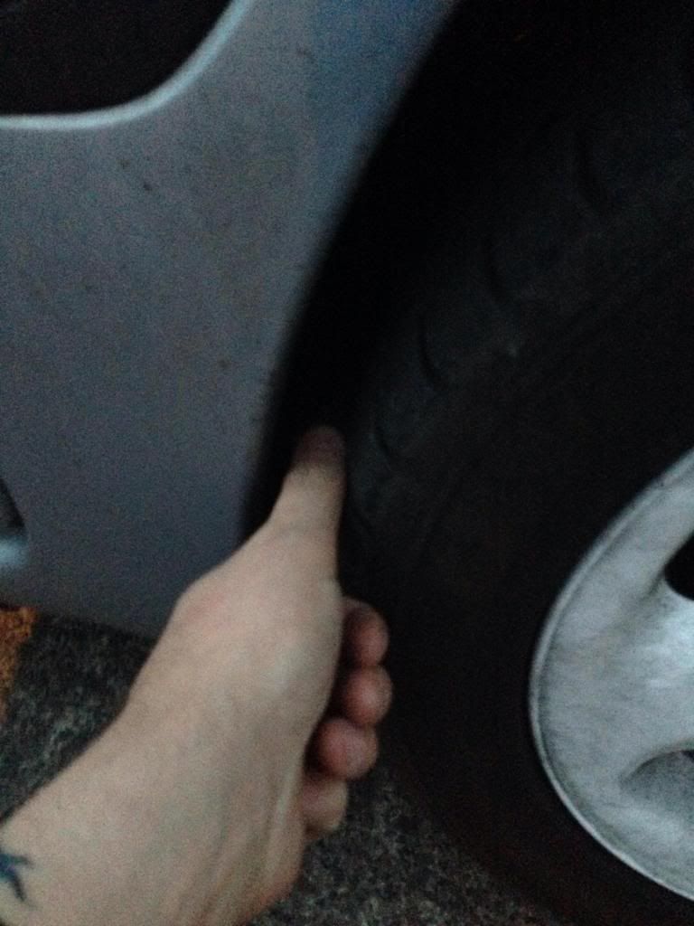 Quick one, pics below are the front wheels, the first is the offside and there is a good gap (about another 5mm on the side if my thumb) between the tyre and the arch. Second is the nearside and is sitting further back, I can just squeeze my thumb in the gap.