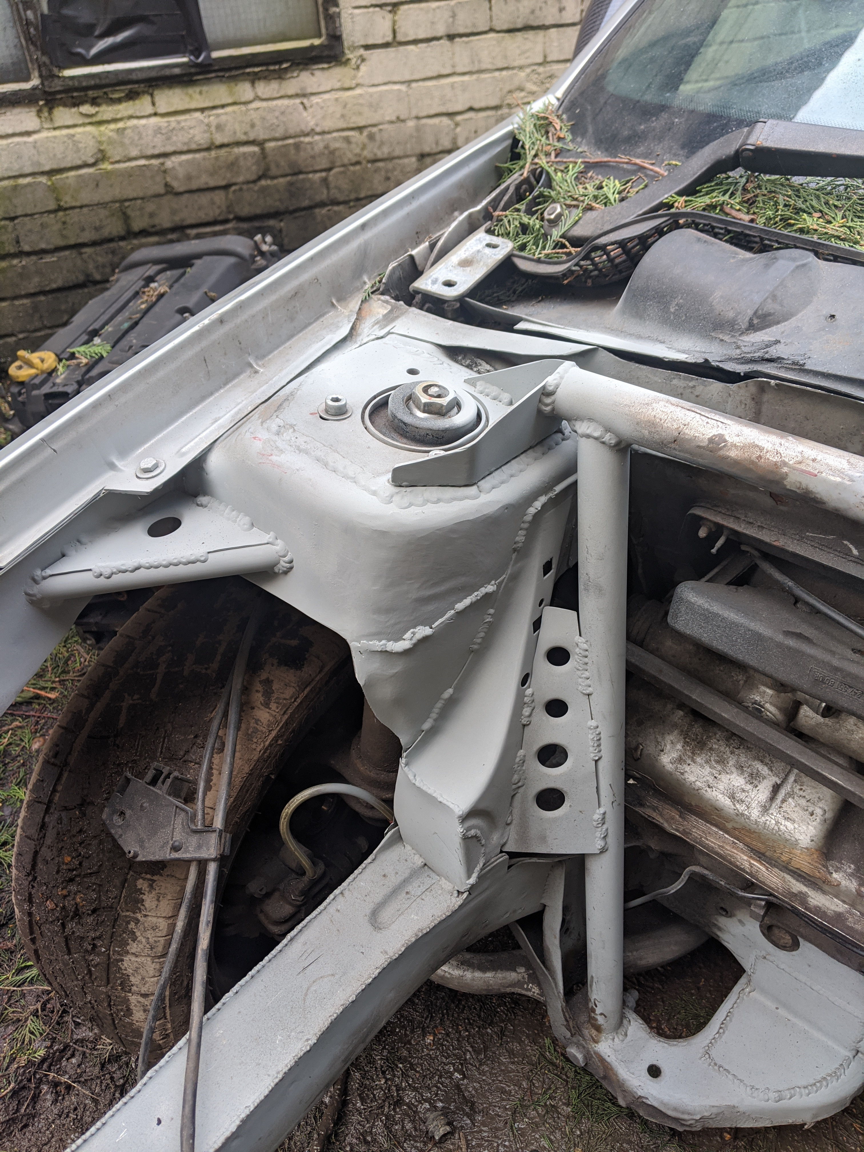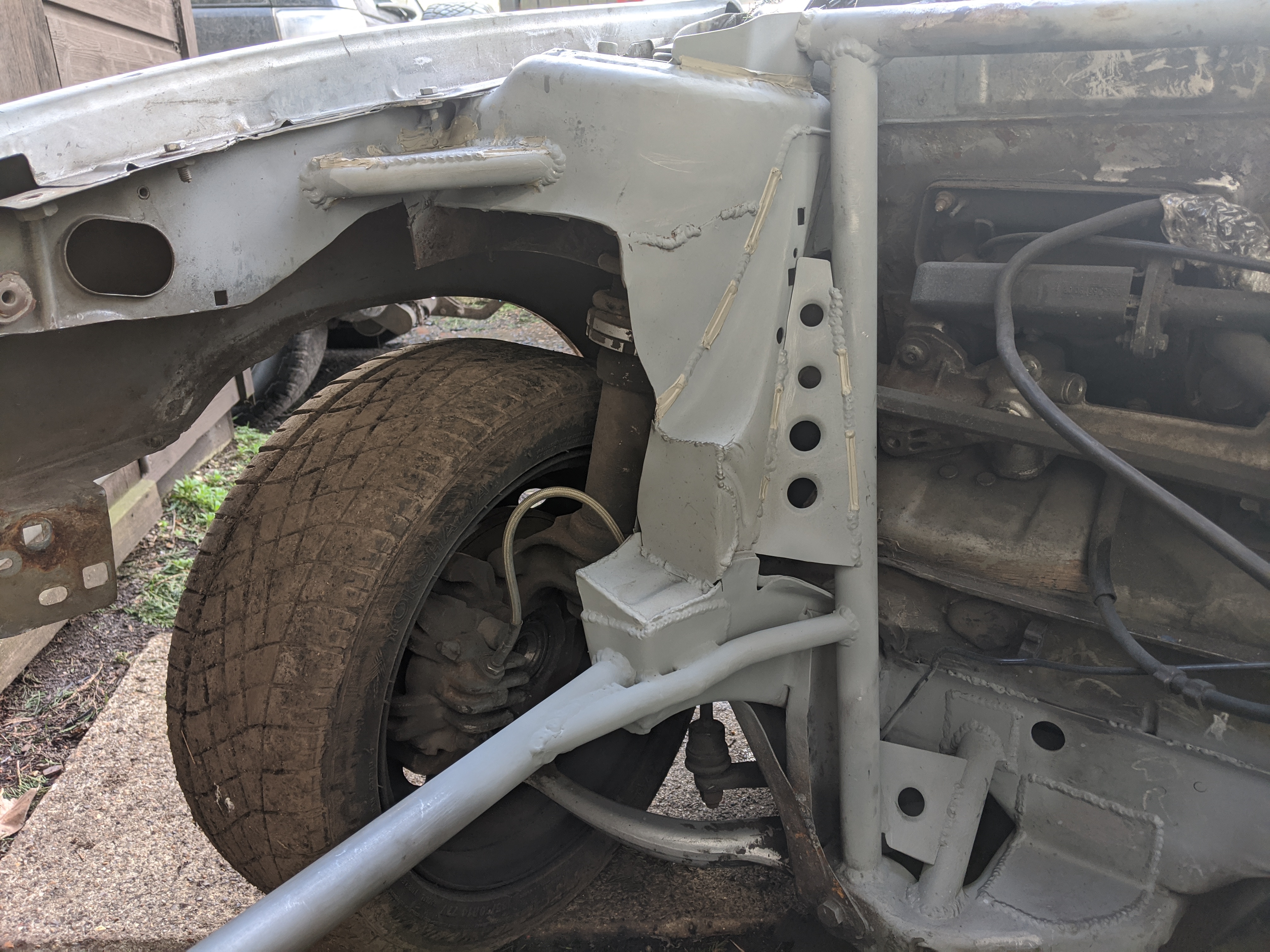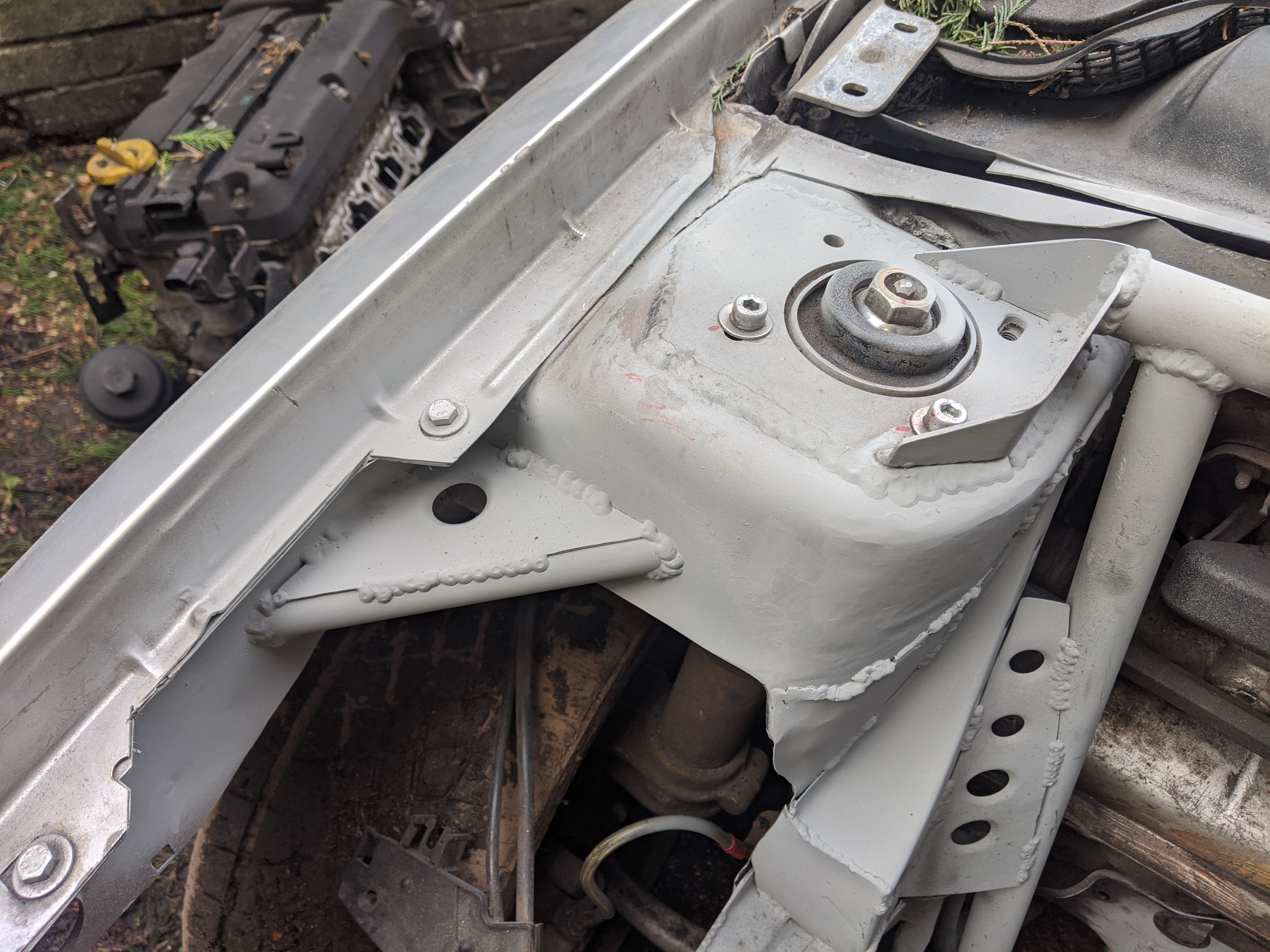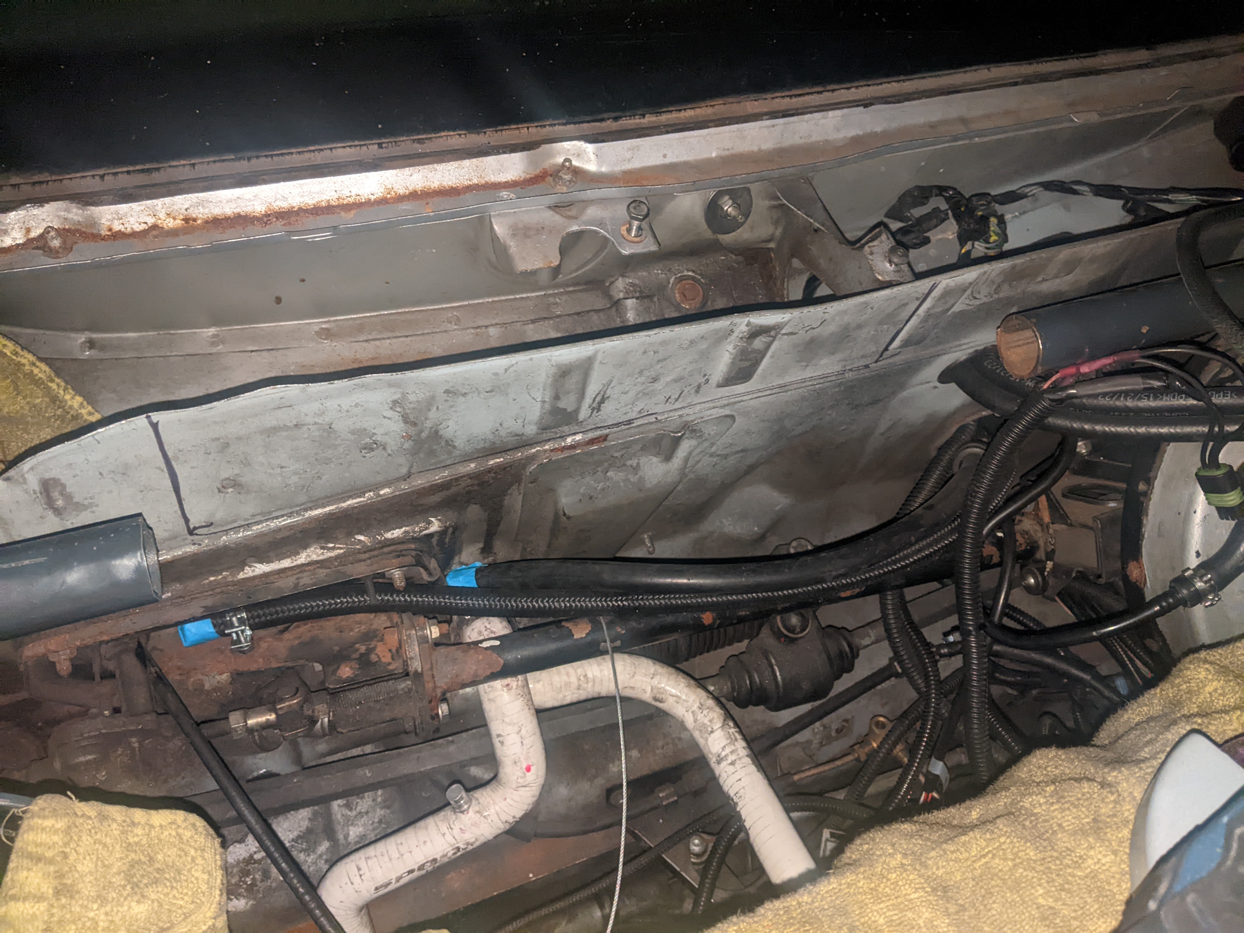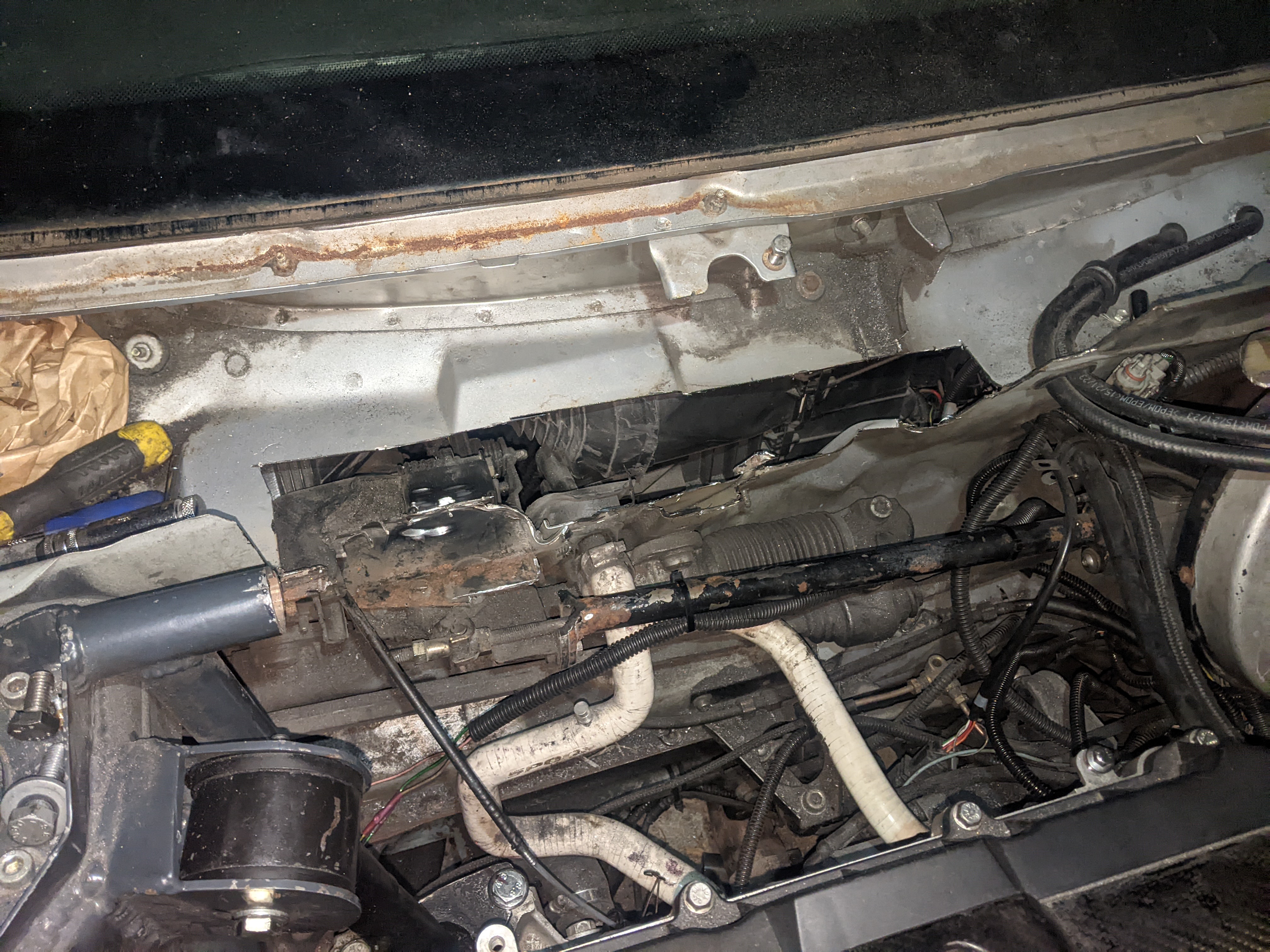 Before putting the new engine in I wanted to do some fab on the engine bay while treating the rust and doing some streghtening too: