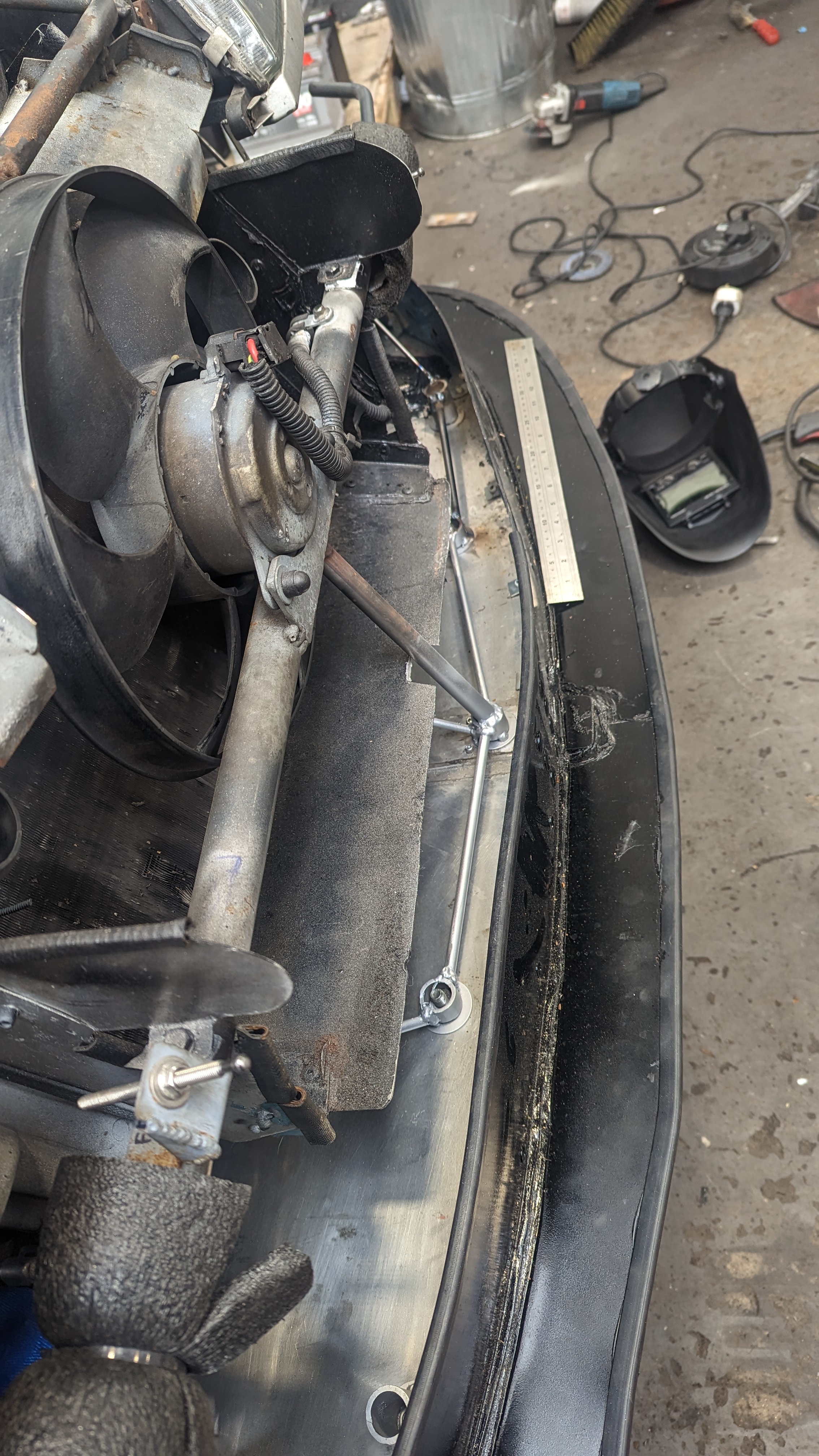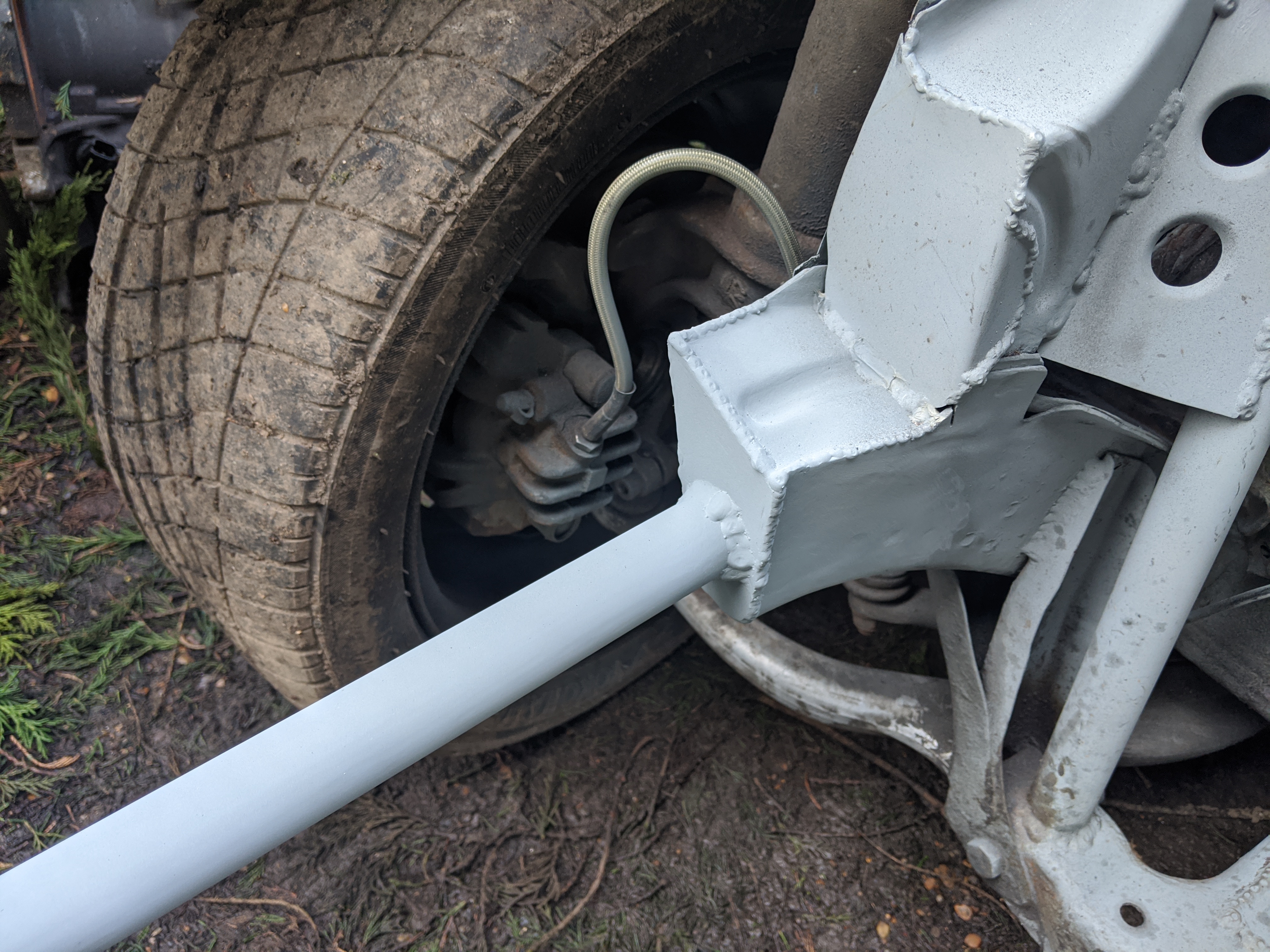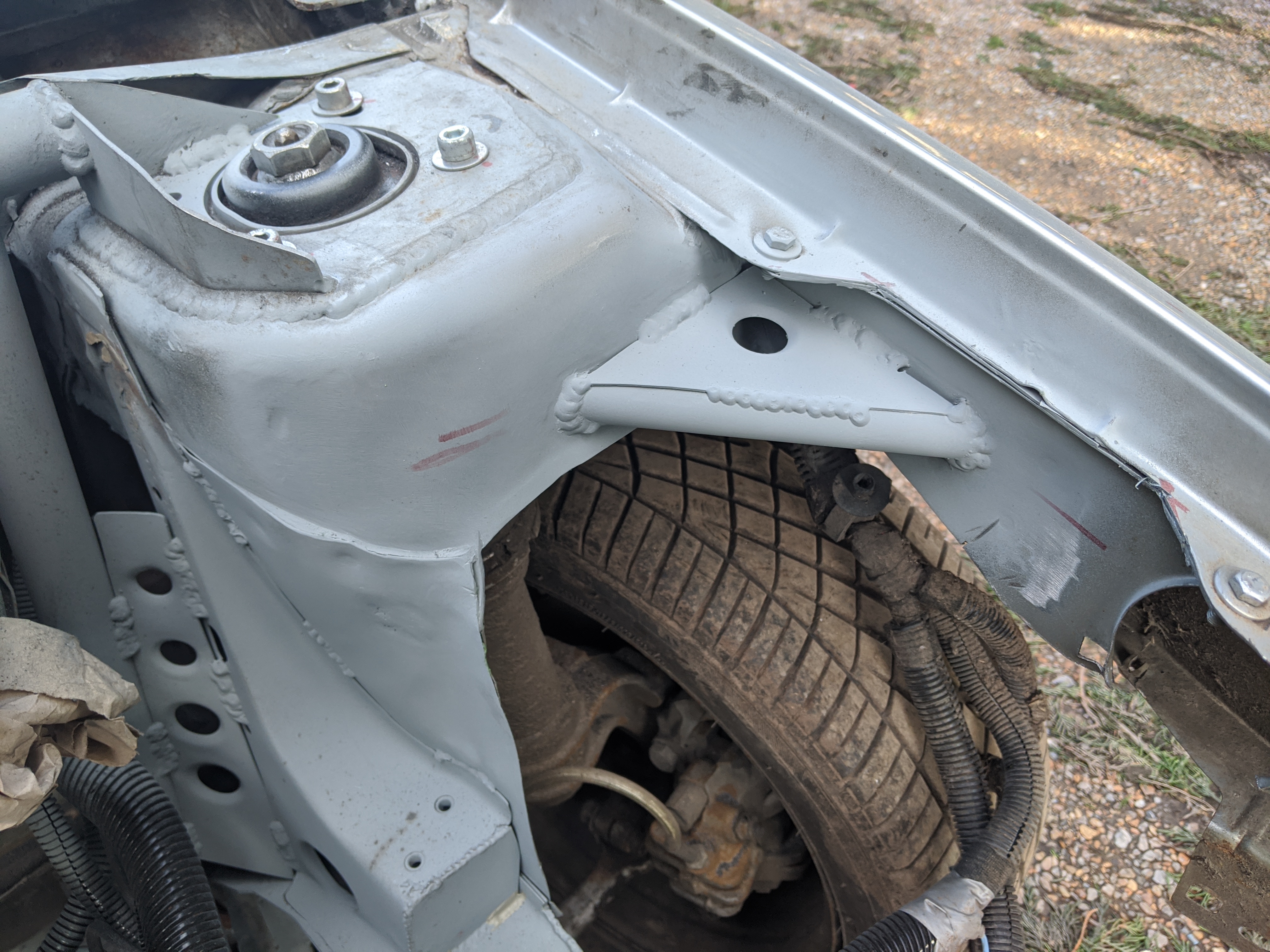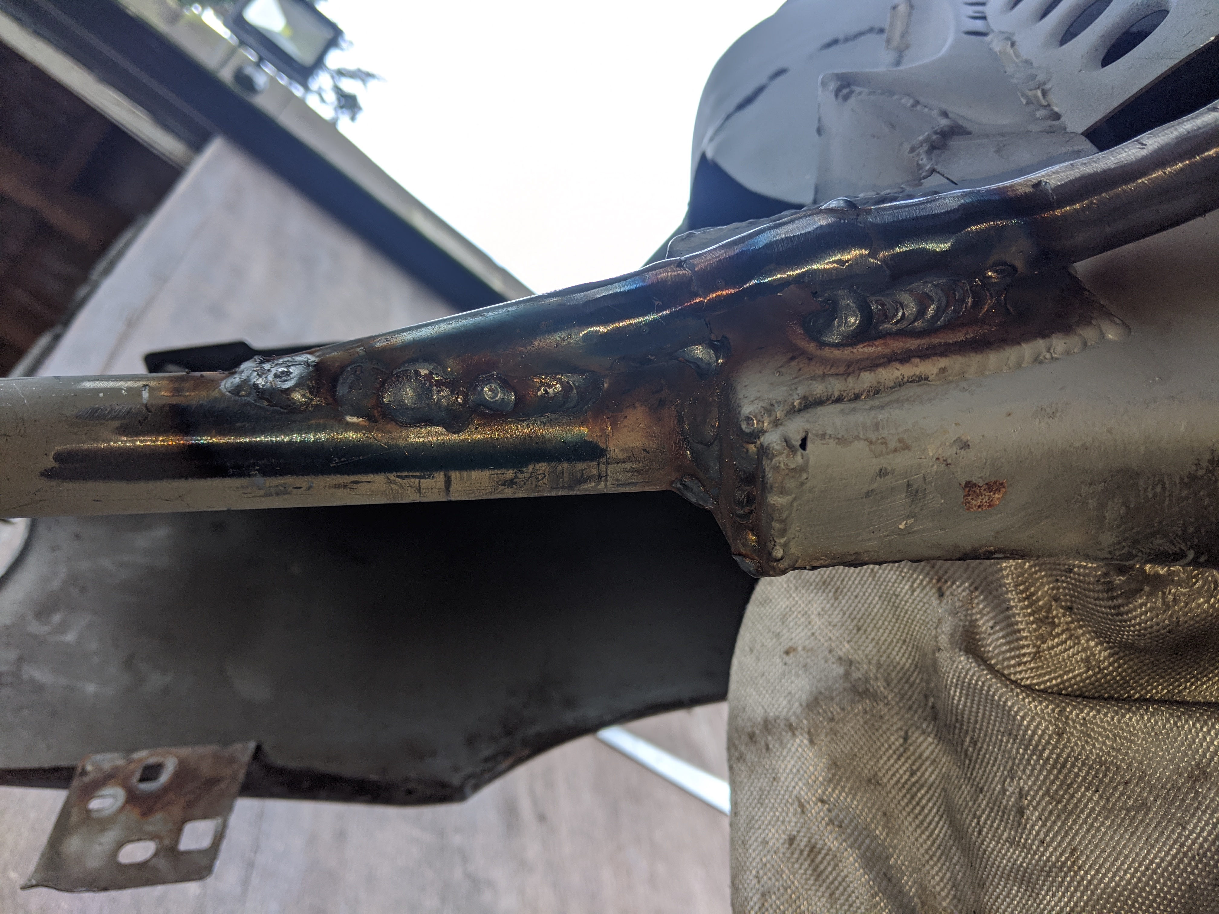 some pictures missing but didn't want a lower brace sticking out of the bottom of the front end so decided to weld on above the chassis leg to do the same job: